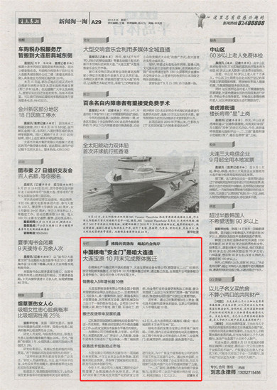 半岛晨报在2011年8月16日A29版中,以“中国核电‘清静门’是咱大连造--大连宝原10月末完成整体搬家”为问题报道了大连宝原核装备有限公司相关情形。原文转载如下: