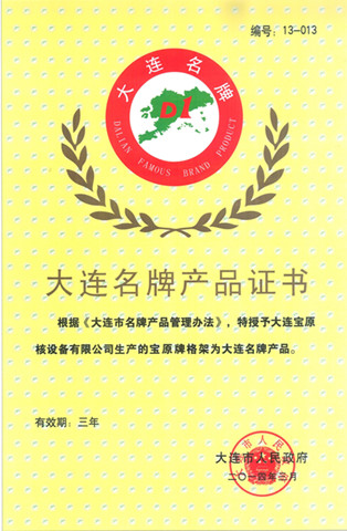凭证《大连市名牌产品治理步伐》,大连宝原核装备有限公司生产的“宝原牌格架”被确以为2014年大连名牌产品,有用期为三年。