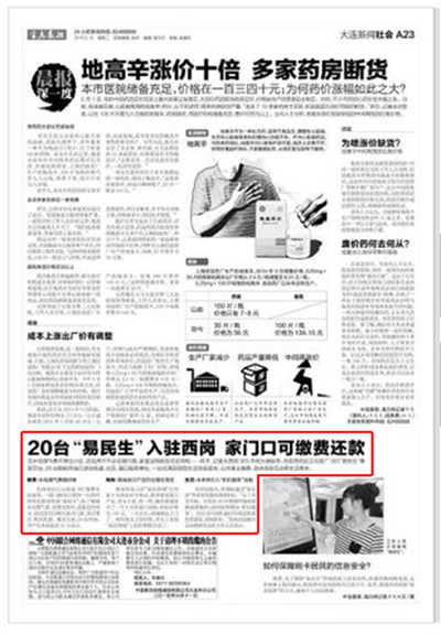 《半岛晨报》在2015年6月16日A23版,以“20台‘易民生’入驻西岗,家门口可缴费还款”为问题对大连迅通网络手艺有限公司“易民生”智能终端举行了报道。原文转载如下: